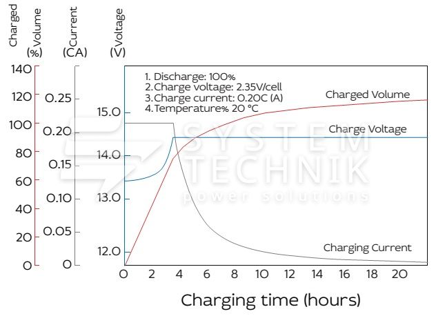 - Рекомендуемое напряжение заряда в циклическом режиме для 12В батареи: 13,8В-14,1В при 25ºС;